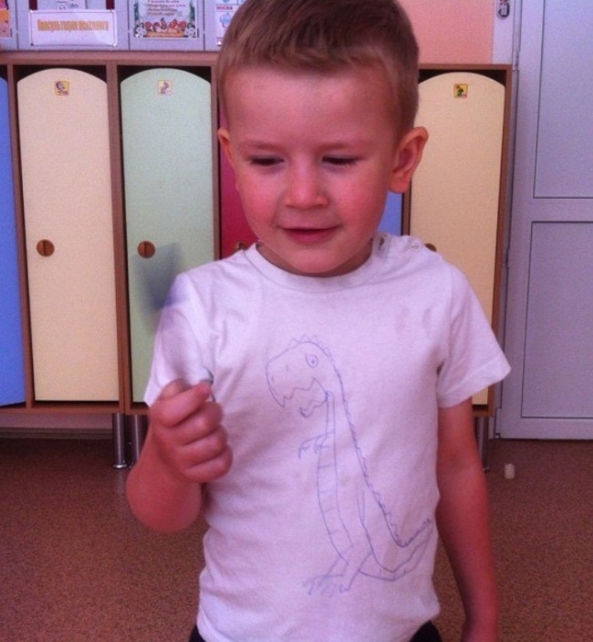 15. This little guy didn't want to wear a white T-shirt to school, so his mum drew on a dinosaur using a washable marker!