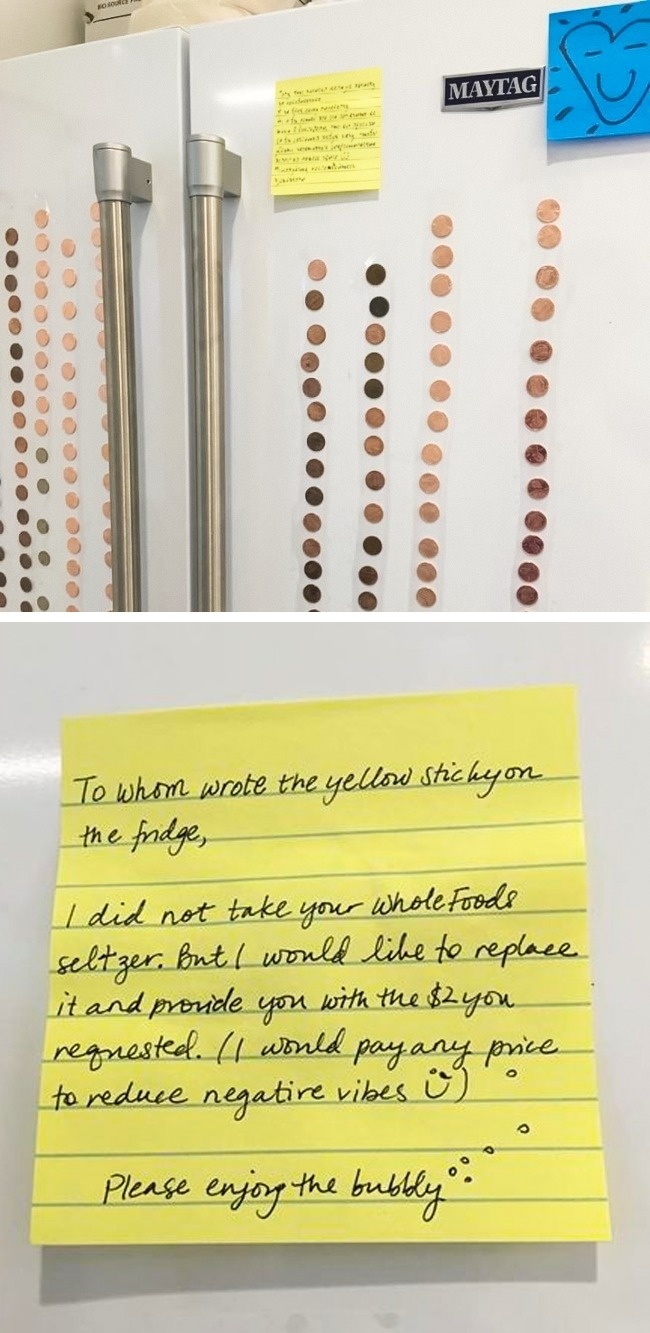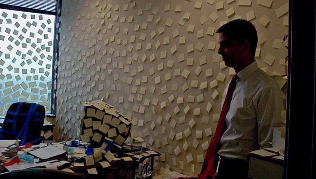 2. "My co-worker told me I use too many Post-Its and should only use them when strictly necessary. I decorated his office..."