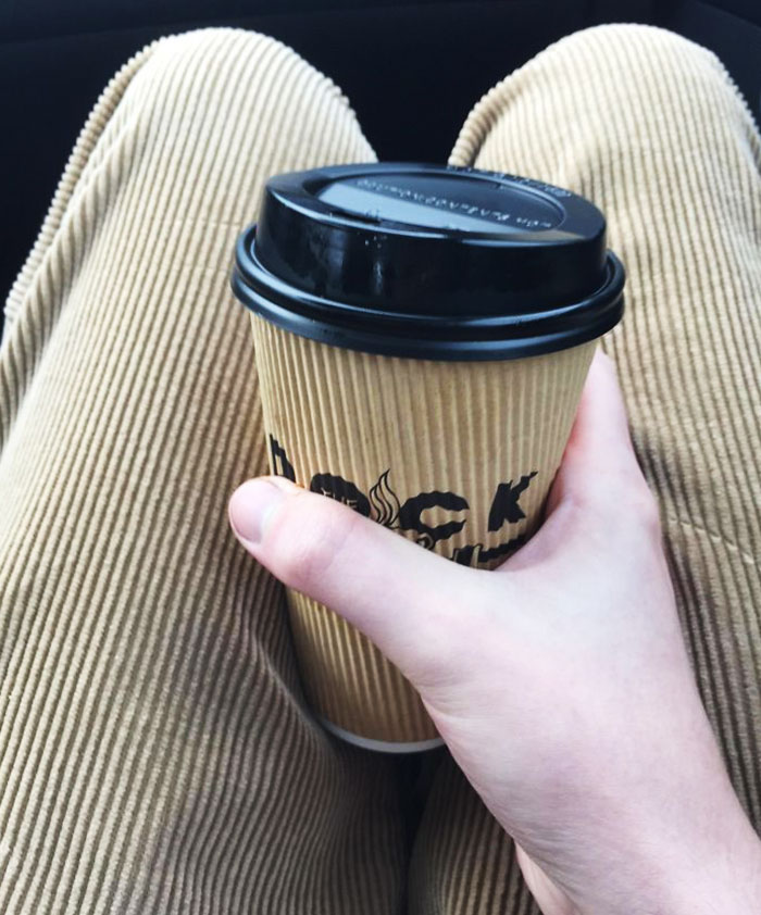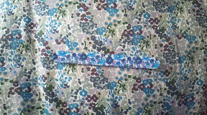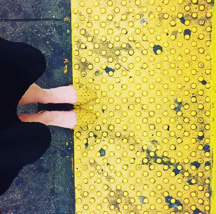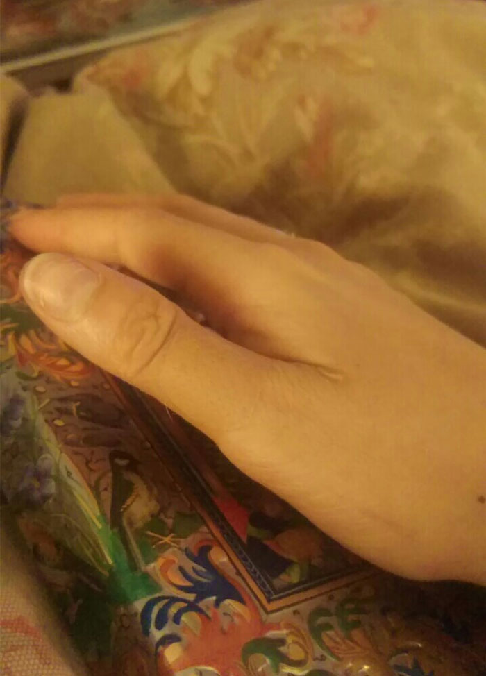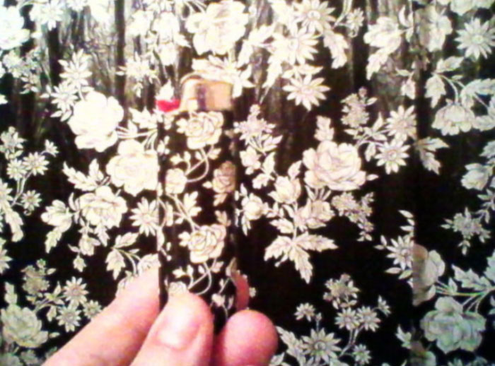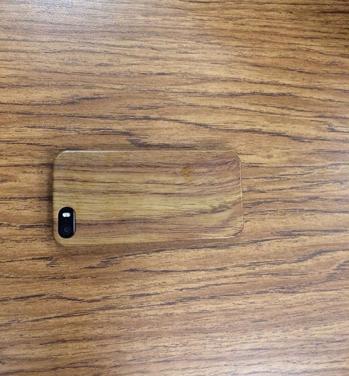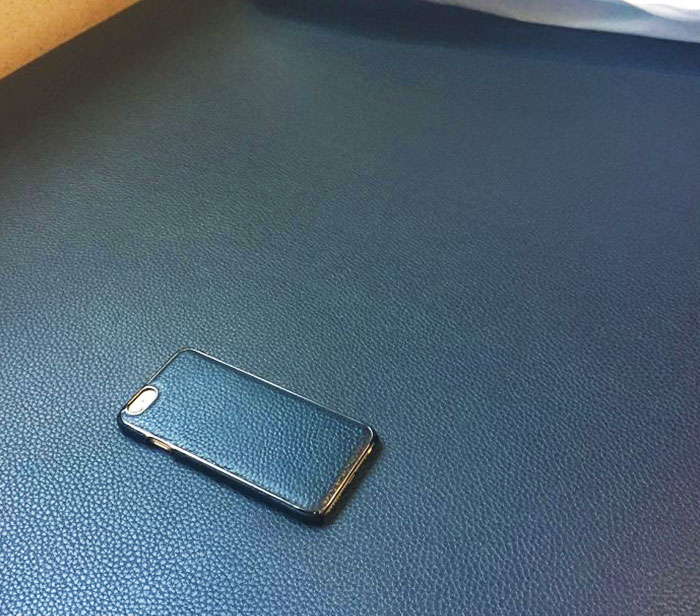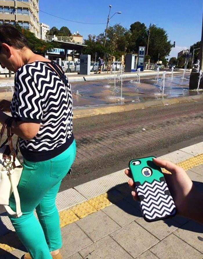 It's beside the right leg: the floral motif on the black border differs from the 3 white flowers on the cell phone's case.