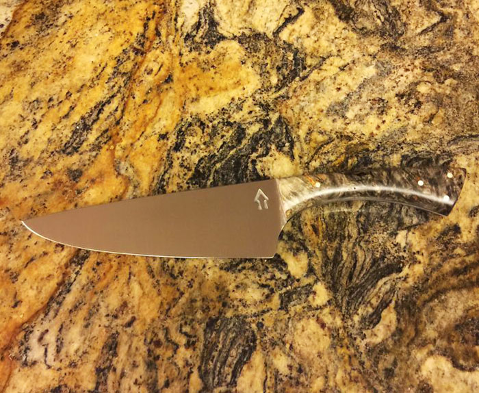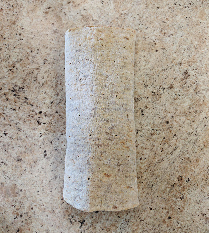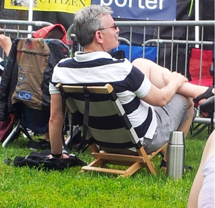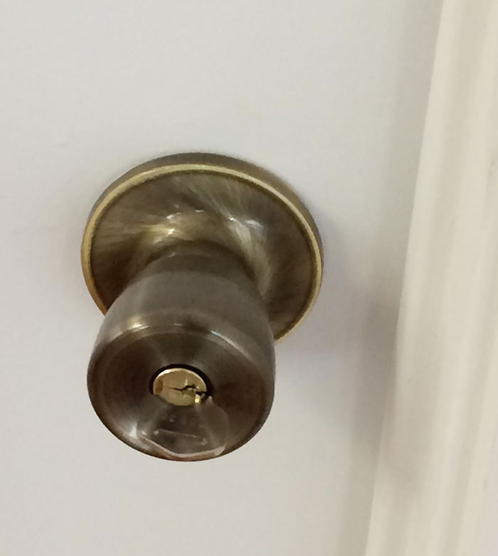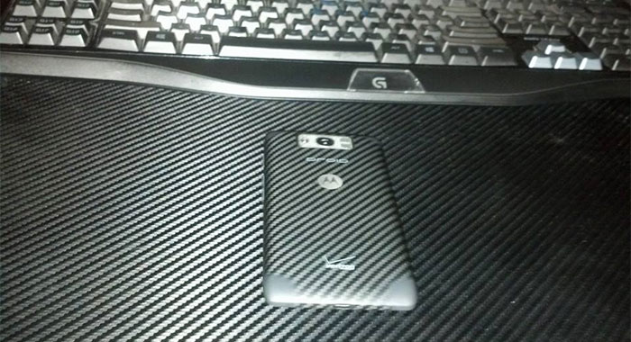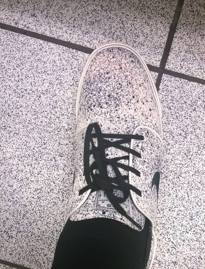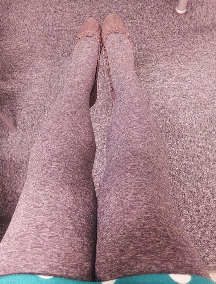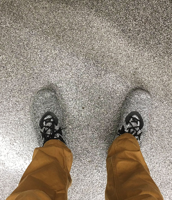It's beside the right leg: the floral motif on the black border differs from the 3 white flowers on the cell phone's case.