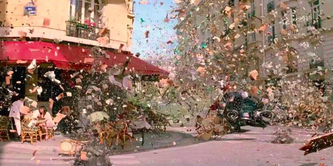 The movie contains a scene that takes place on the terrace of a Parisian café, in which a series of slow motion explosions occur. Instead of using a green screen, he opted for air guns and special cameras to shoot at 1,500 frames per second. A true cinematic artist!