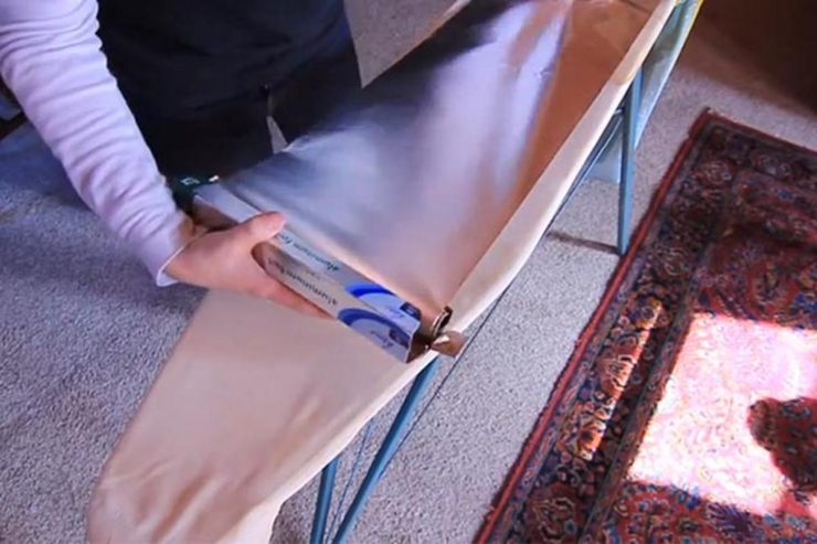 Place a strip of aluminum foil over the entire surface of your ironing board, under the cover. Replace the cover and start ironing. Indeed, aluminum absorbs heat.