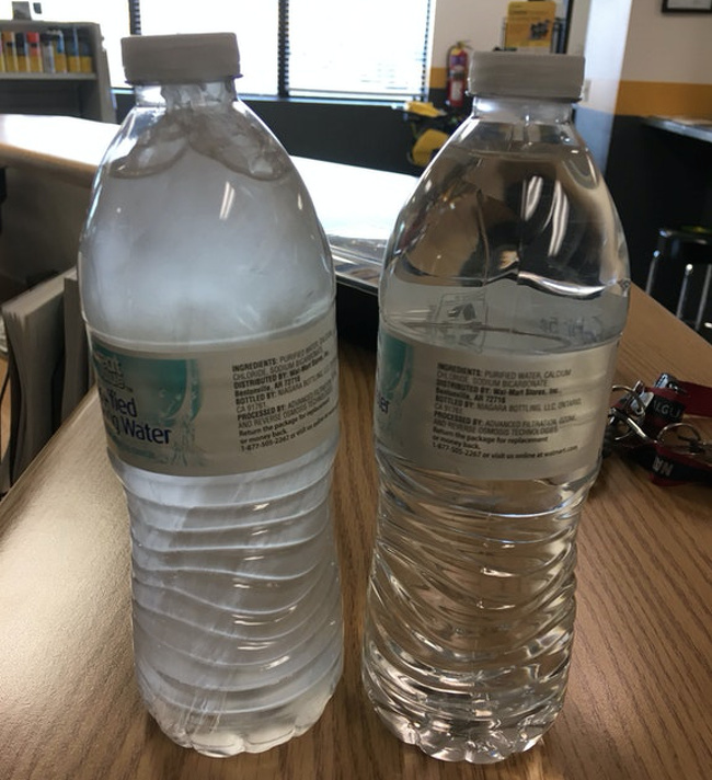 14. Two bottles of water were left overnight in the same car at the same temperature. One froze, the other didn't! Go figure...
