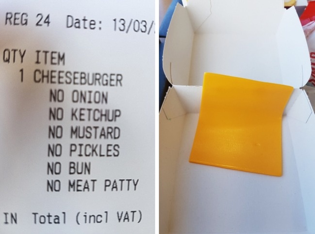 2. A customer who ordered a cheeseburger without onion, sauces, gherkins, bread or meat! Bon appetit!