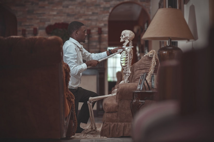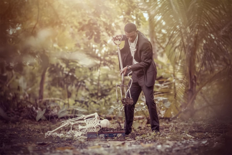 But the photographer finishes his series on a hopeful note; that in fact we can determine that the man will eventually come out of this downward spiral. He refuses to let himself be dragged by the skeleton, takes his knife to cut the rope, and buries the skeleton, before leaving, freed...