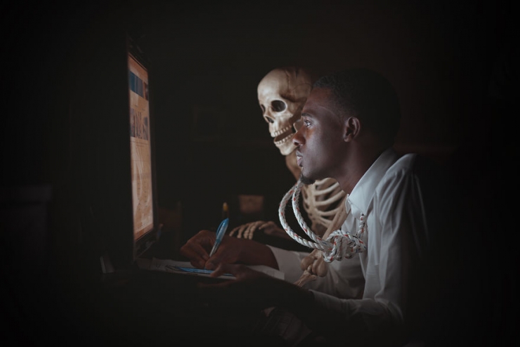 The snapshots he took show a man totally trapped by his work and his torment. A rope tied around his neck, like a tie, and the skeleton that he's permanently dragging, symbolize this suffering.